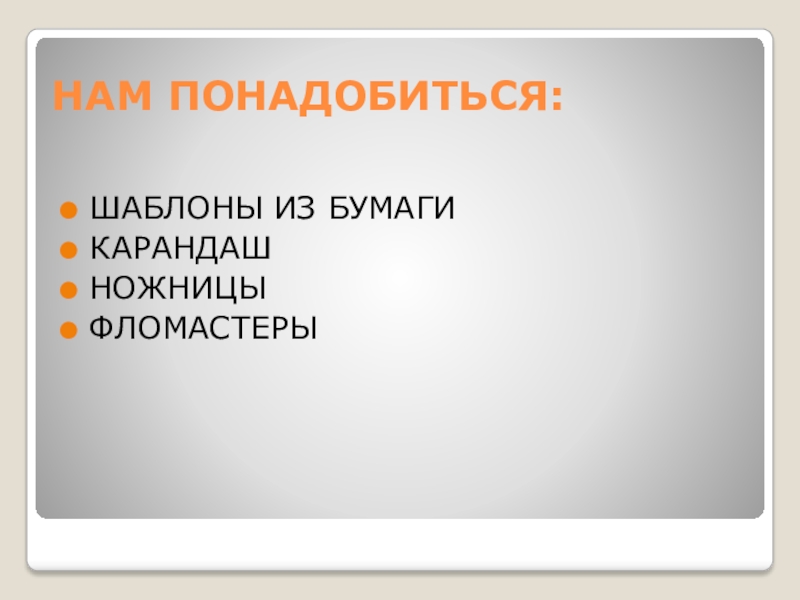 НАМ ПОНАДОБИТЬСЯ:ШАБЛОНЫ ИЗ БУМАГИКАРАНДАШНОЖНИЦЫФЛОМАСТЕРЫ