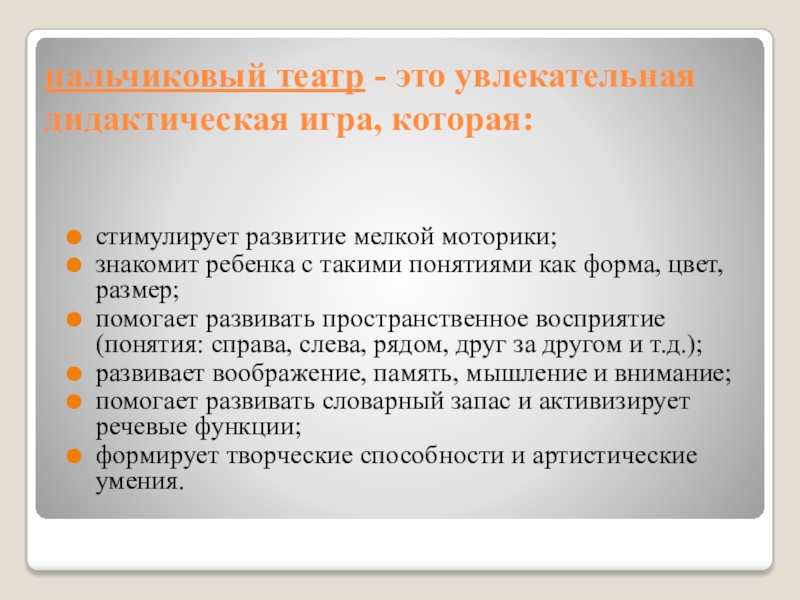 Слайд 2пальчиковый театр - это увлекательная дидактическая игра, которая: