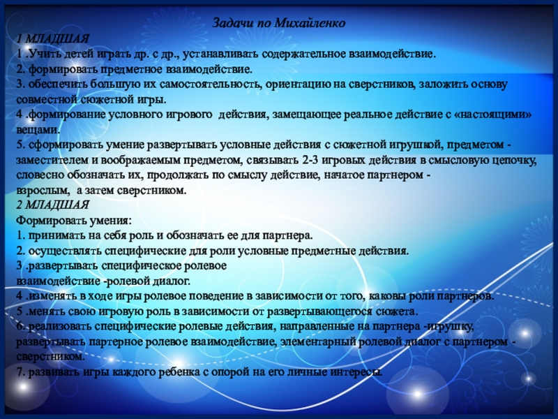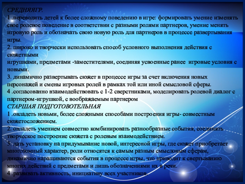 2. овладеть умением совместно комбинировать разнообразные события, соединять творческое построение сюжета с ролевым взаимодействием.