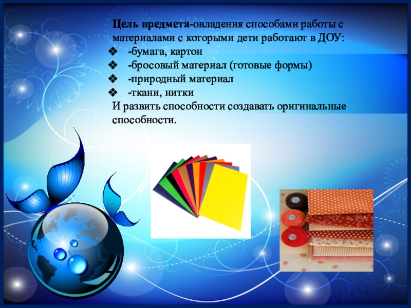 Слайд 16Цель предмета-овладения способами работы с материалами с которыми дети работают в