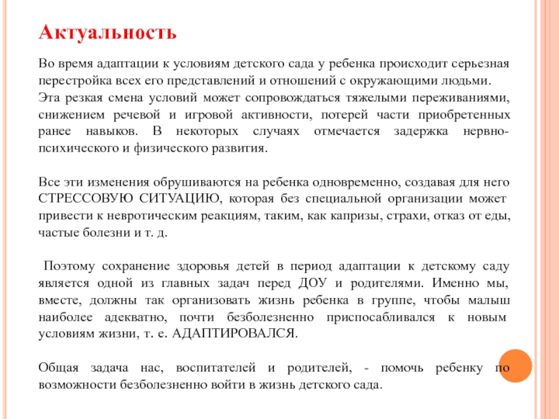 Преодоление стрессовых состояний у детей раннего возраста в период адаптации к детскому саду;