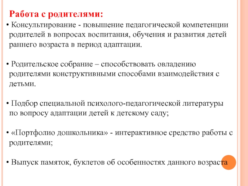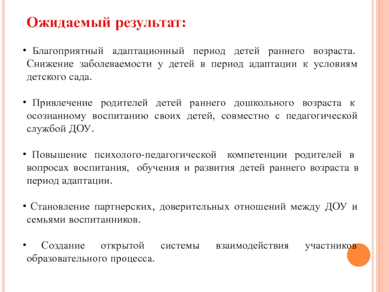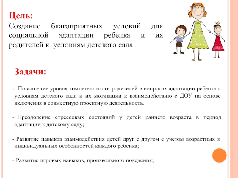 Повышение уровня компетентности родителей в вопросах адаптации ребенка к условиям детского сада и их мотивации к взаимодействию с ДОУ на основе включения в совместную проектную деятельность.