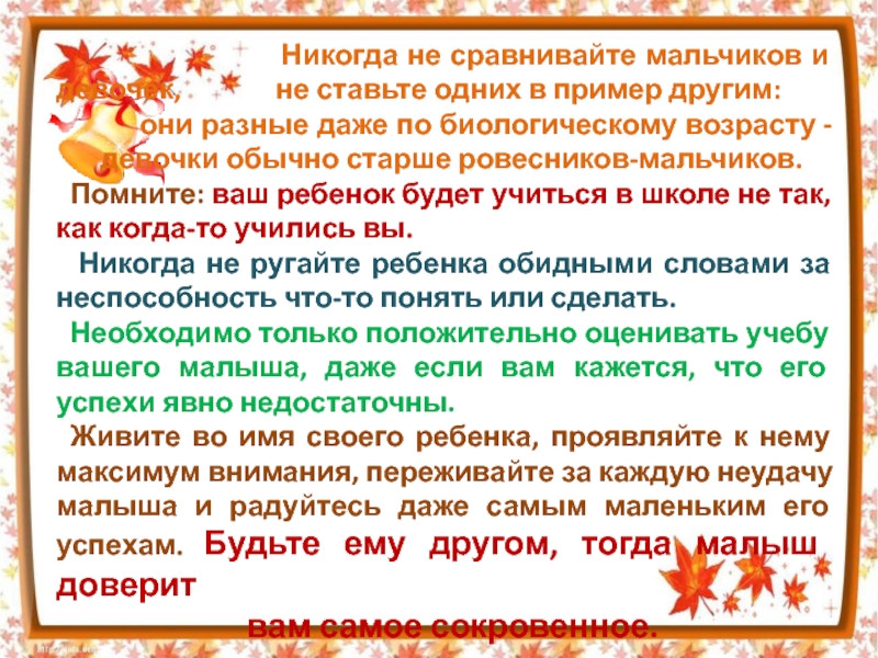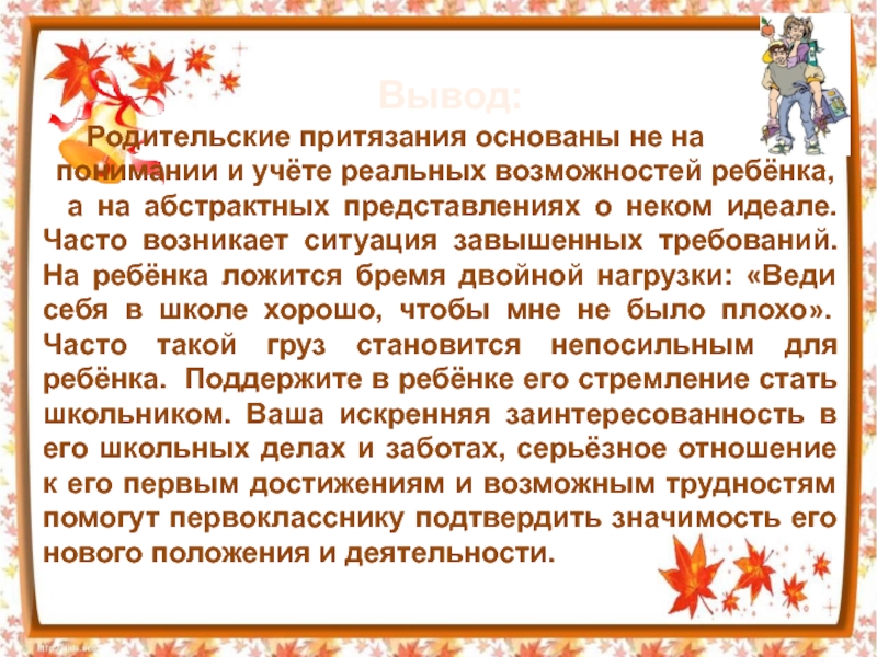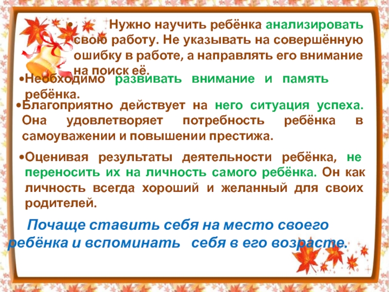 Оценивая результаты деятельности ребёнка, не переносить их на личность самого ребёнка. Он как личность всегда хороший и желанный для своих родителей.