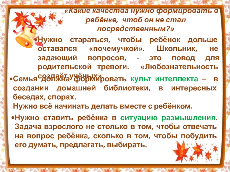 Нужно стараться, чтобы ребёнок дольше оставался «почемучкой». Школьник, не задающий вопросов, - это повод для родительской тревоги. «Любознательность создаёт учёных».