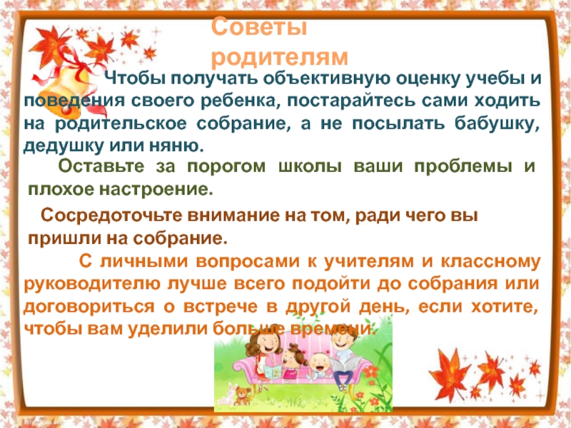 С личными вопросами к учителям и классному руководителю лучше всего подойти до собрания или договориться о встрече в другой день, если хотите, чтобы вам уделили больше времени.