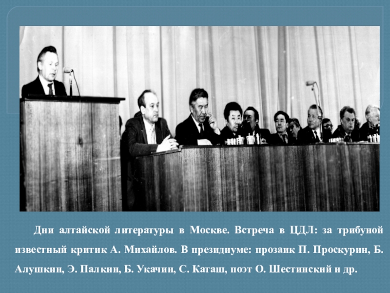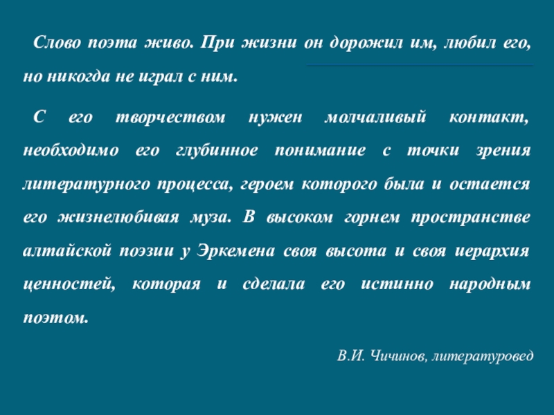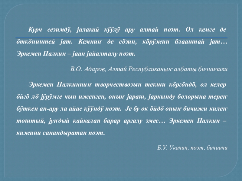 1991) – талантливый алтайский поэт, прозаик, известный публицист и общественный деятель. Родился 14 февраля 1934 года в с. Ело Онгудайского района. Закончил Литературный институт им. А.М. Горького в Москве (1957), член Союза писателей (1958). Первый поэтический сборник – «Јаҥы кижи» («Новый человек») (1956). С тех пор издано более 20 его книг. Заслуженный работник культуры РСФСР (1982), награжден орденом Дружбы народов (1984).