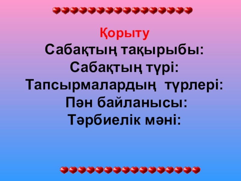 Слайд 12Қорыту Сабақтың тақырыбы: Сабақтың түрі: Тапсырмалардың түрлері: