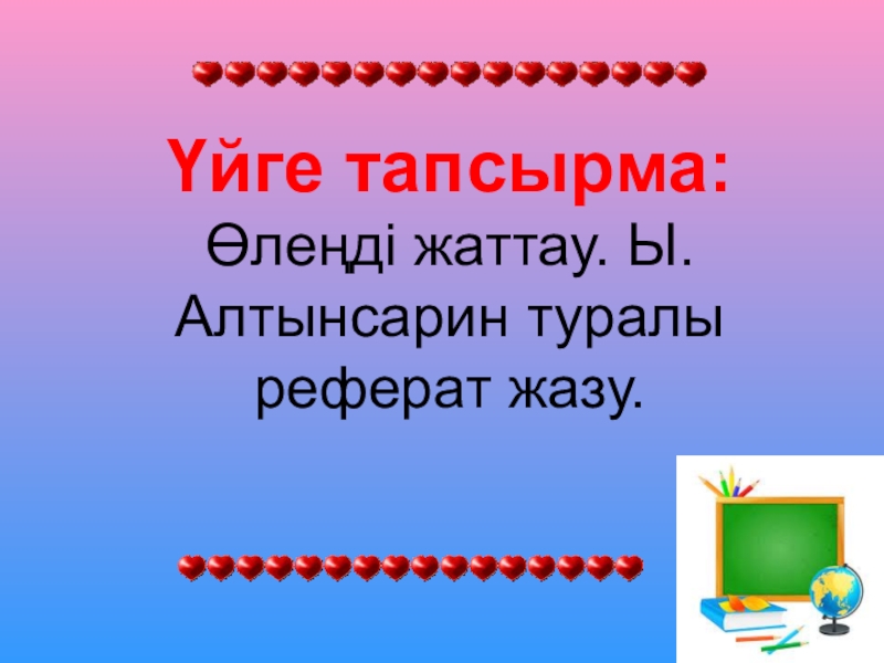 Слайд 13Үйге тапсырма: Өлеңді жаттау. Ы.Алтынсарин туралы реферат жазу.