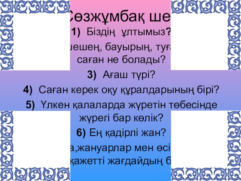 Сөзжұмбақ шешу1) Біздің ұлтымыз?  2) Әке-шешең, бауырың, туған қалаң саған не болады? 3) Ағаш