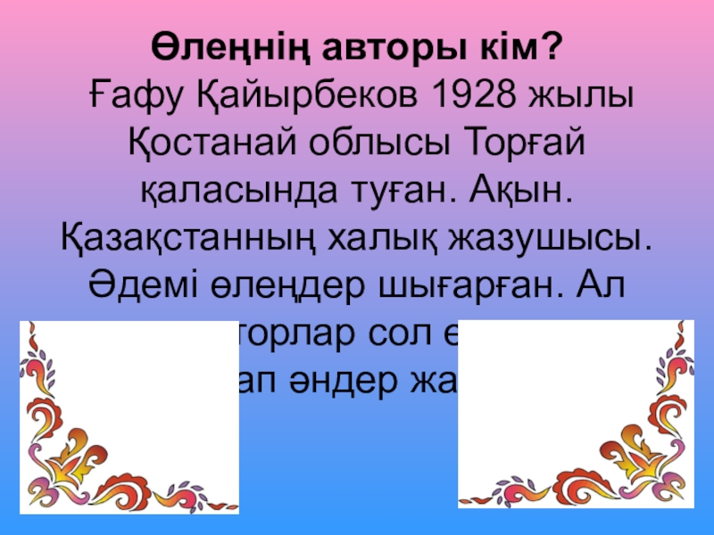 Слайд 5Өлеңнің авторы кім? Ғафу Қайырбеков 1928 жылы Қостанай облысы Торғай қаласында