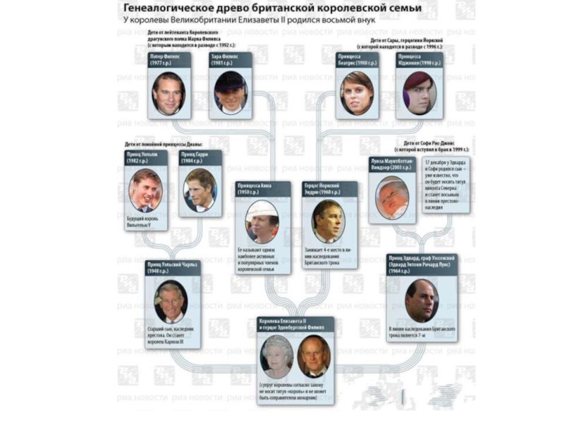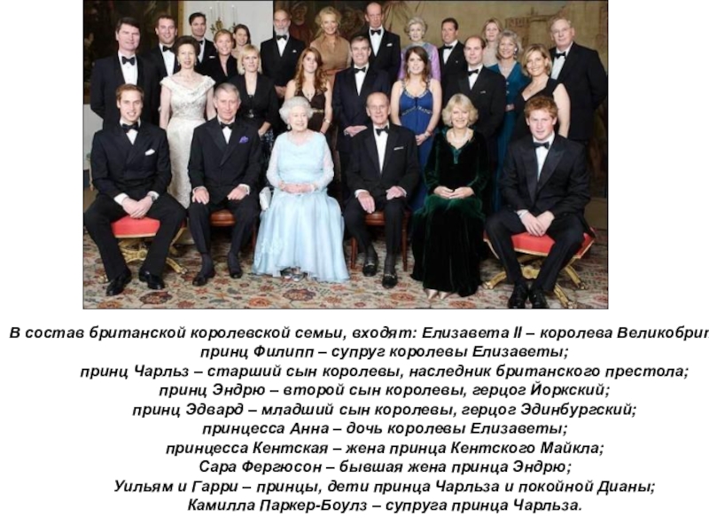 В состав британской королевской семьи, входят: Елизавета II – королева Великобритании;принц Филипп – супруг королевы Елизаветы;принц Чарльз – старший сын королевы, наследник британского престола;принц Эндрю – второй сын королевы, герцог Йоркский;принц Эдвард – младший сын королевы,
