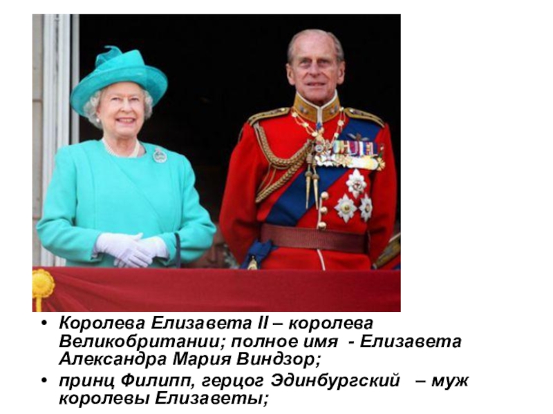 Королева Елизавета II – королева Великобритании; полное имя - Елизавета Александра Мария Виндзор;принц Филипп, герцог Эдинбургский