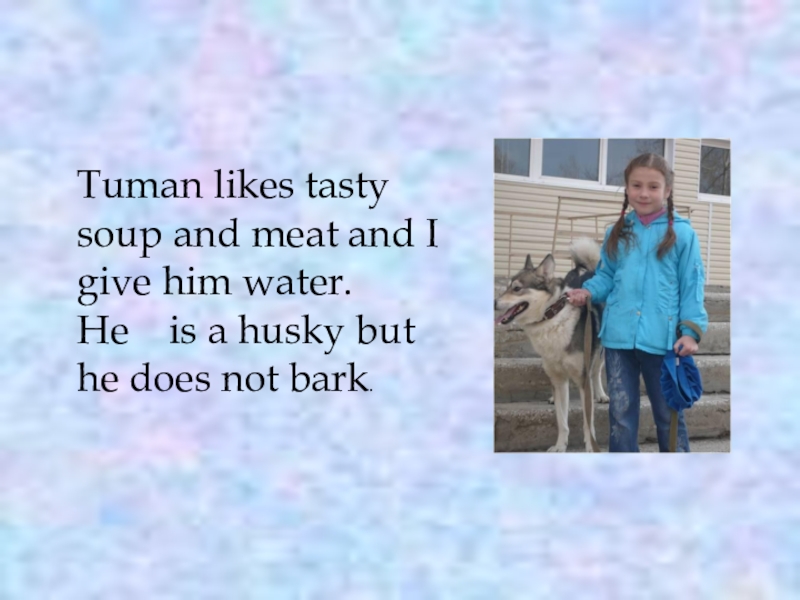 Слайд 5Tuman likes tasty soup and meat and I give him water.