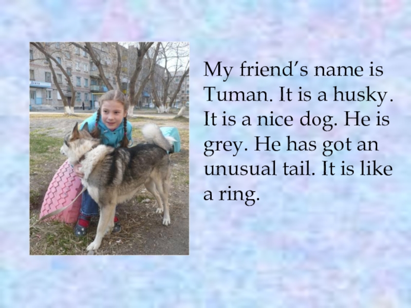 My friend’s name is Tuman. It is a husky. It is a nice dоg. He is grey.