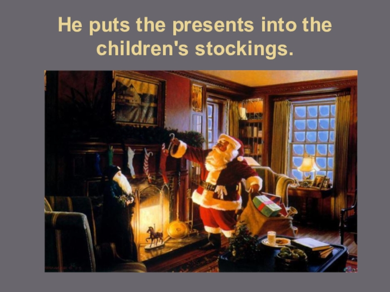 Слайд 14He puts the presents into the children's stockings.