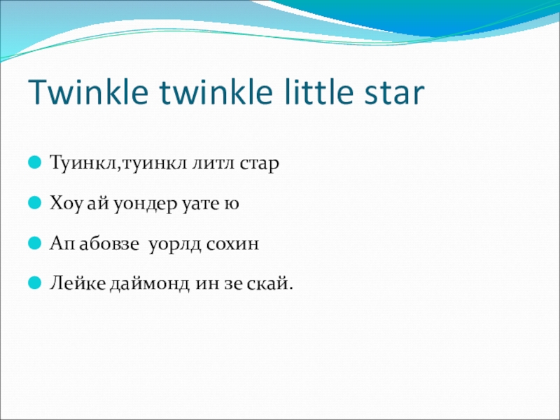 Twinkle twinkle little starТуинкл,туинкл литл старХоу ай уондер уате юАп абовзе уорлд сохинЛейке даймонд ин зе скай.
