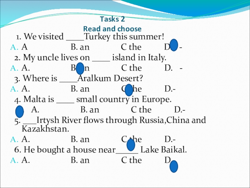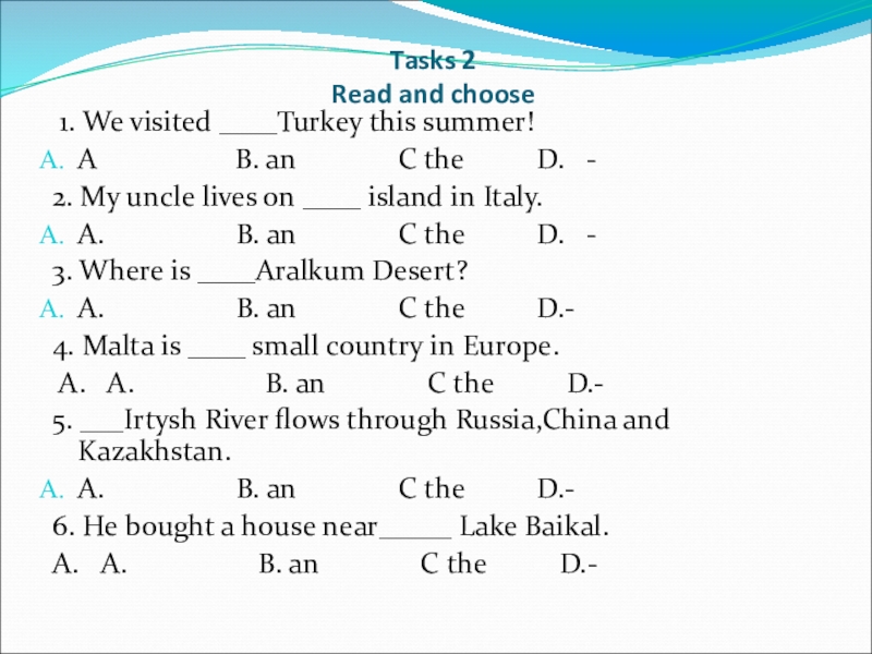 Tasks 2  Read and choose 1. We visited ____Turkey this summer! A