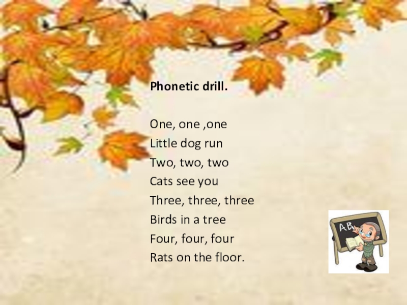 Phonetic drill.One, one ,oneLittle dog runTwo, two, twoCats see youThree, three, threeBirds in a treeFour, four, fourRats on the floor.