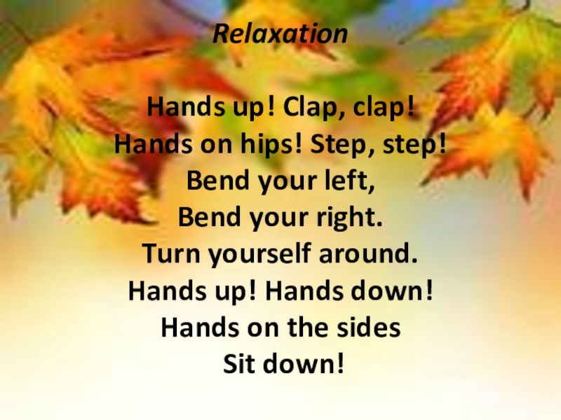 Слайд 10Relaxation Hands up! Clap, clap! Hands on hips! Step, step! Bend your left, Bend your