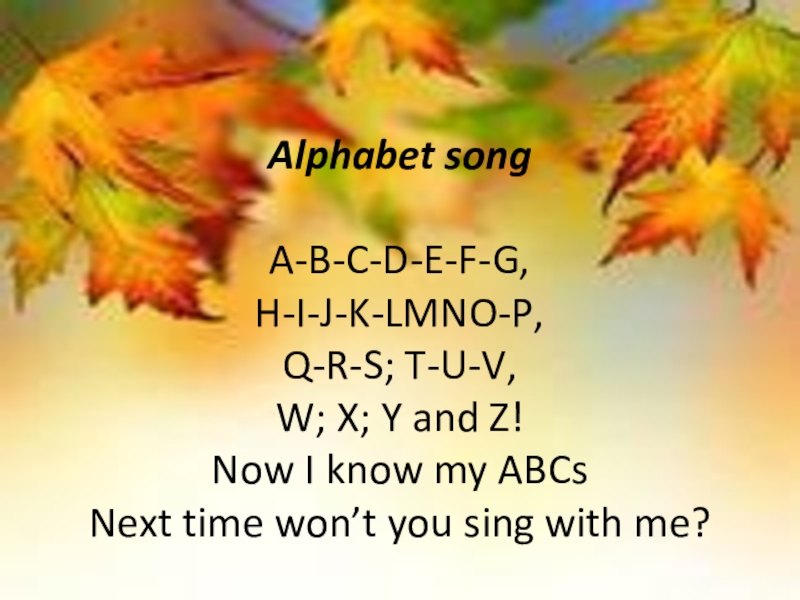 Слайд 4 Alphabet song A-B-C-D-E-F-G, H-I-J-K-LMNO-P, Q-R-S; T-U-V, W; X; Y and Z! Now I know