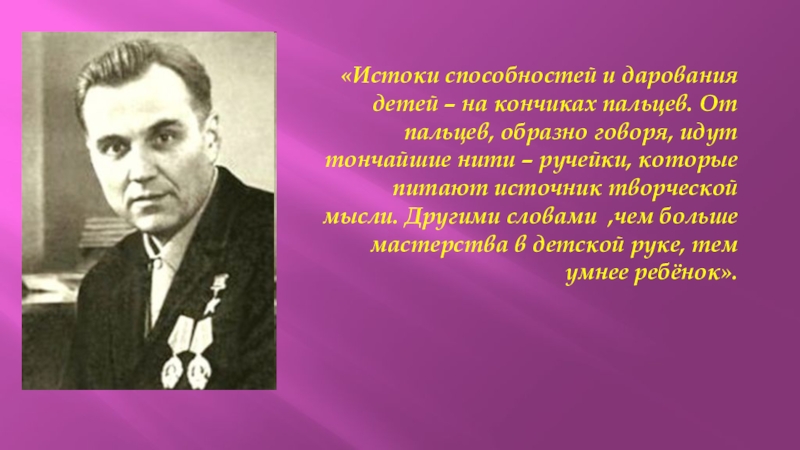 «Истоки способностей и дарования детей – на кончиках пальцев. От пальцев, образно говоря, идут тончайшие нити – ручейки, которые питают источник творческой мысли. Другими словами ,чем больше мастерства в детской руке, тем умнее ребёнок».