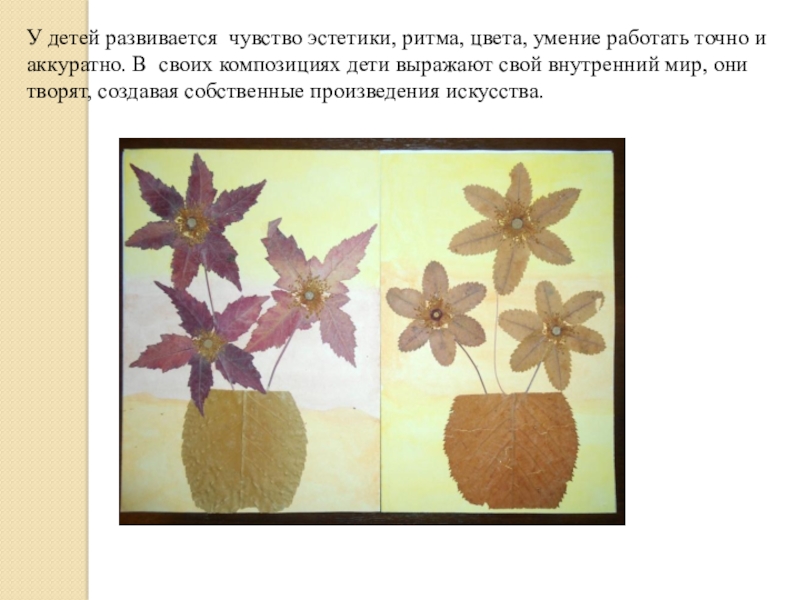 У детей развивается  чувство эстетики, ритма, цвета, умение работать точно и аккуратно. В  своих композициях дети выражают