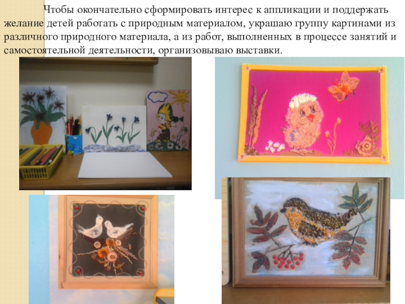 к аппликации и поддержать желание детей работать с природным материалом, украшаю группу картинами из различного природного материала, а из работ, выполненных в процессе занятий и самостоятельной деятельности, организовываю выставки.