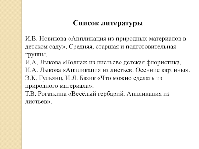 Список литературыИ.В. Новикова «Аппликация из природных материалов в детском саду». Средняя, старшая и подготовительная группы.И.А. Лыкова «Коллаж