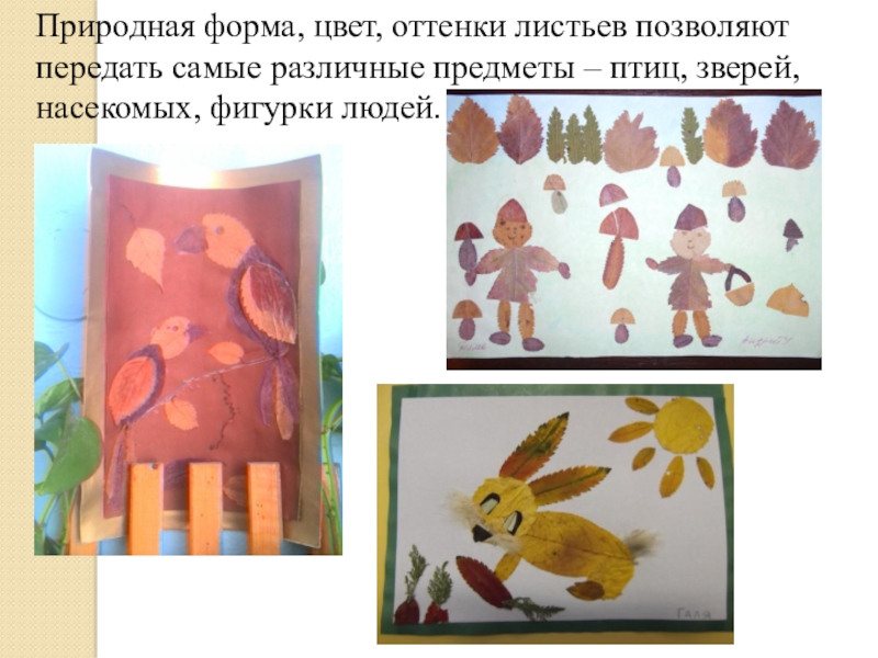 Слайд 10Природная форма, цвет, оттенки листьев позволяют передать самые различные предметы –