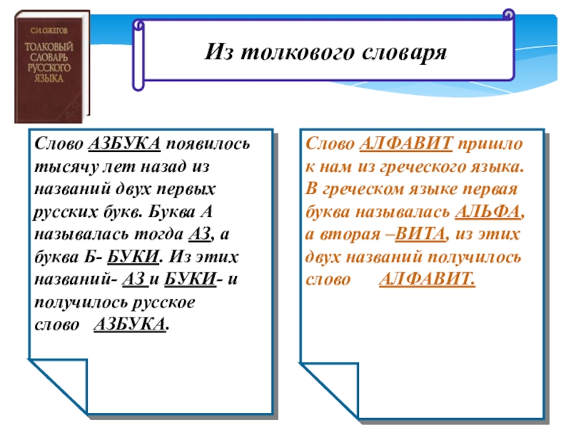 Слово АЛФАВИТ пришло к нам из греческого языка. В греческом языке первая буква называлась АЛЬФА, а вторая –ВИТА, из этих двух названий получилось слово АЛФАВИТ.