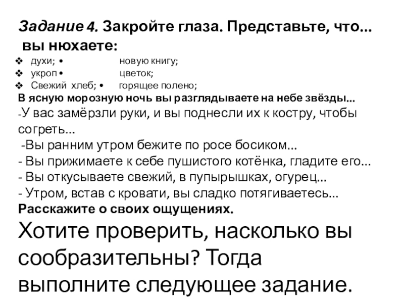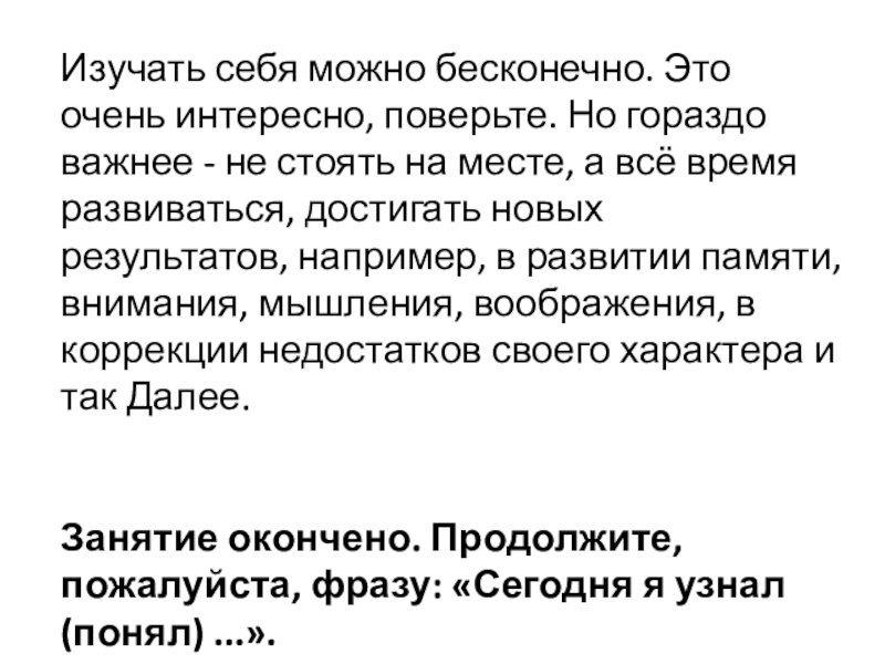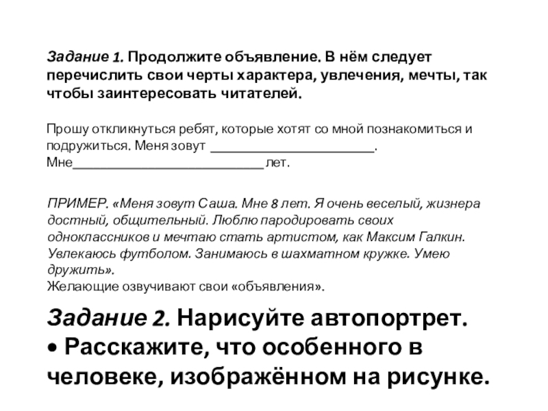 ПРИМЕР. «Меня зовут Саша. Мне 8 лет. Я очень веселый, жизнерадостный, общительный. Люблю пародировать своих одноклассников и мечтаю стать артистом, как Максим Галкин. Увлекаюсь футболом. Занимаюсь в шахматном кружке. Умею дружить».