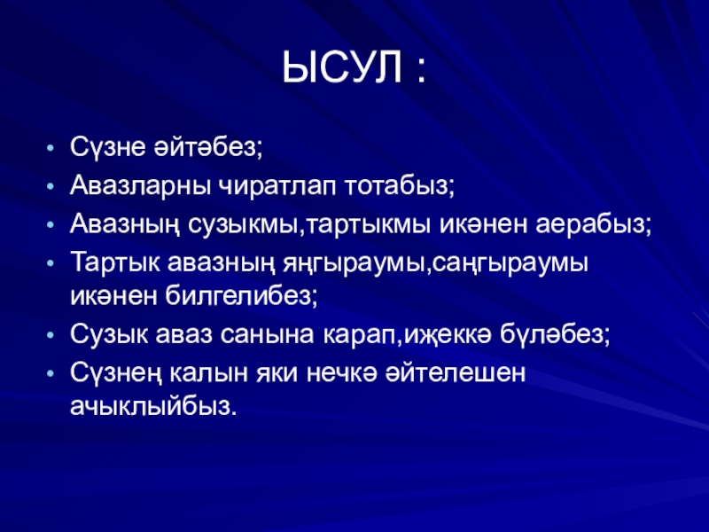 ЫСУЛ :Сүзне әйтәбез;Авазларны чиратлап тотабыз;Авазның сузыкмы,тартыкмы икәнен аерабыз;Тартык авазның яңгыраумы,саңгыраумы икәнен билгелибез;Сузык аваз санына карап,иҗеккә бүләбез;Сүзнең калын