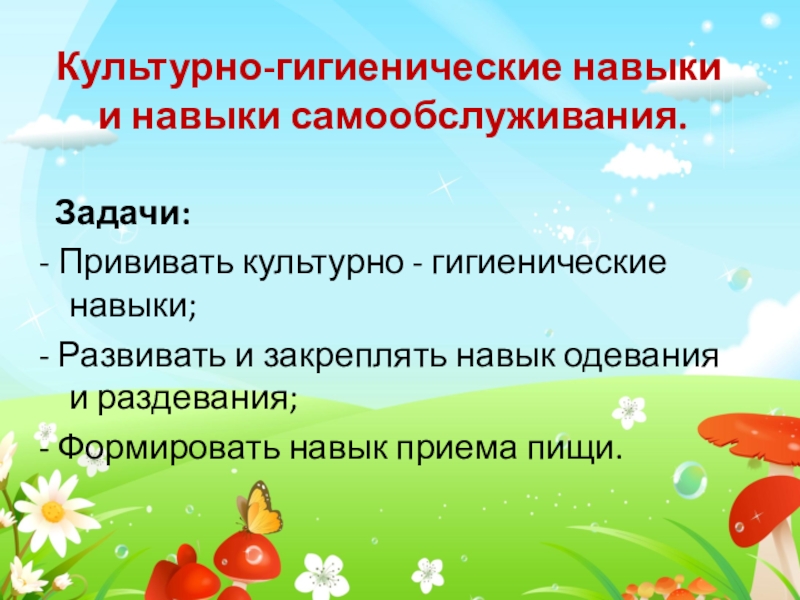 Культурно-гигиенические навыки  и навыки самообслуживания. Задачи: - Прививать культурно - гигиенические навыки;- Развивать и закреплять навык