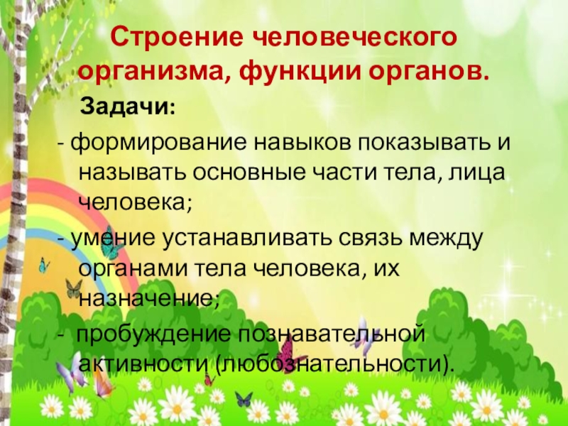 Строение человеческого организма, функции органов.  Задачи:- формирование навыков показывать и называть основные части тела, лица человека;-
