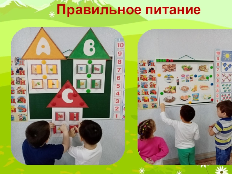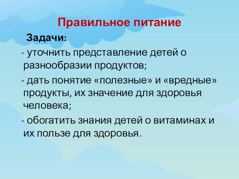 Правильное питание   Задачи:  - уточнить представление детей о разнообразии продуктов;  - дать понятие