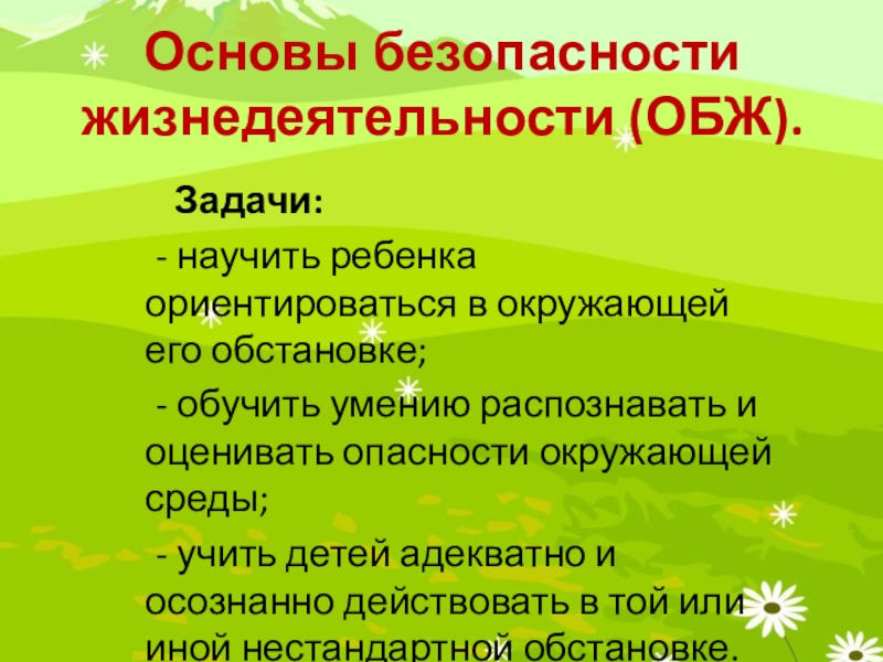 Основы безопасности жизнедеятельности (ОБЖ).    Задачи:    - научить ребенка ориентироваться в окружающей