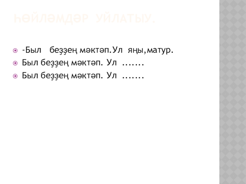 Һөйләмдәр уйлатыу. -Был  беҙҙең мәктәп.Ул яңы,матур.Был беҙҙең мәктәп. Ул .......Был беҙҙең мәктәп. Ул .......