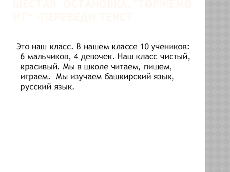 Шестая остановка.“Тәржемә ит“ –переведи текст  Это наш класс. В нашем классе 10 учеников: 6 мальчиков, 4