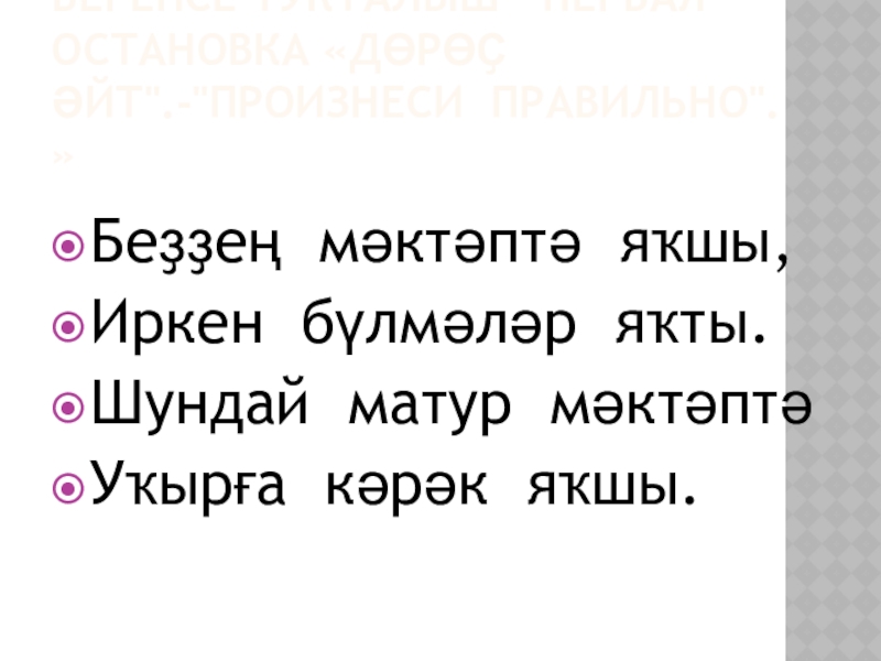 Слайд 11 Беренсе тукталыш – первая остановка «Дөрөҫ әйт".-"Произнеси правильно". »