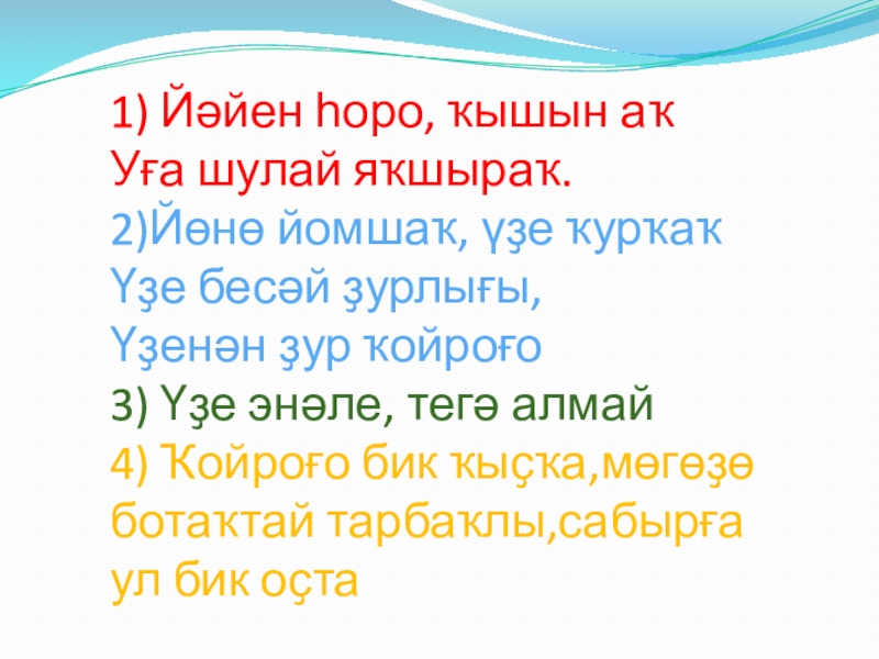 Слайд 3 1) Йәйен һоро, ҡышын аҡ Уға шулай яҡшыраҡ. 2)Йөнө йомшаҡ, үҙе ҡурҡаҡ Үҙе
