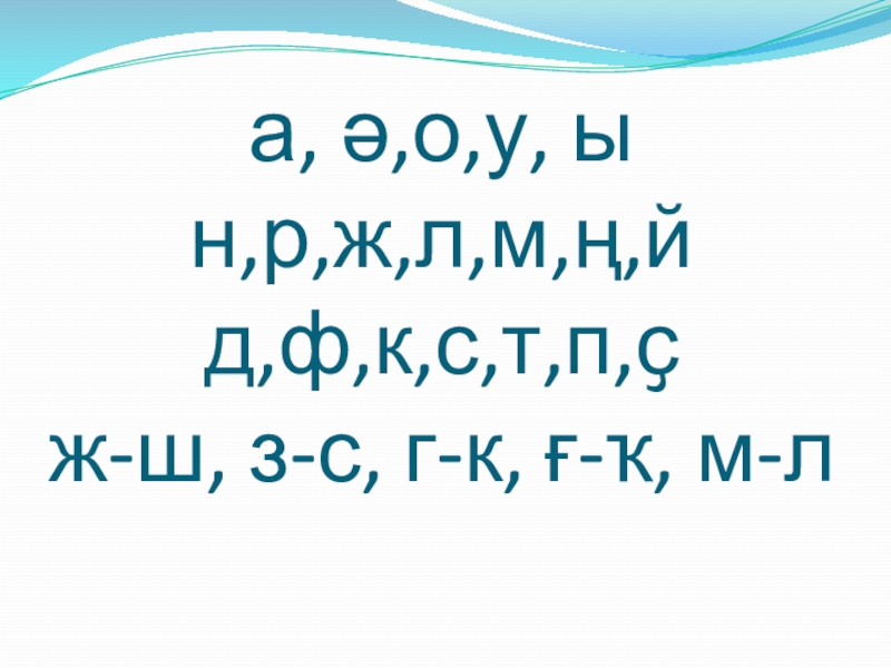 Слайд 5 а, ә,о,у, ы н,р,ж,л,м,ң,й д,ф,к,с,т,п,ҫ ж-ш, з-с, г-к, ғ-ҡ, м-л