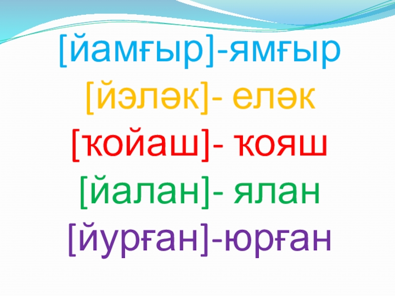 Слайд 7[йамғыр]-ямғыр [йэләк]- еләк [ҡойаш]- ҡояш [йалан]- ялан [йурған]-юрған