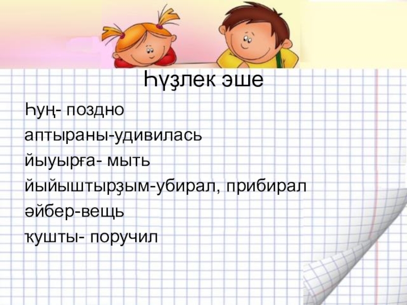 Һүҙлек эшеҺуң- поздноаптыраны-удивиласьйыуырға- мытьйыйыштырҙым-убирал, прибираләйбер-вещьҡушты- поручил