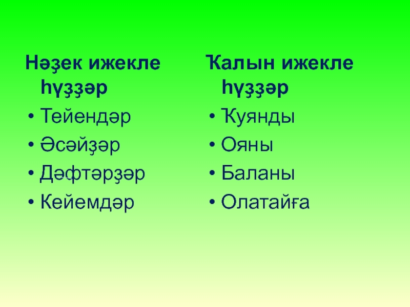 Нәҙек ижекле һүҙҙәрТейендәрӘсәйҙәрДәфтәрҙәрКейемдәрҠалын ижекле һүҙҙәрҠуяндыОяныБаланыОлатайға