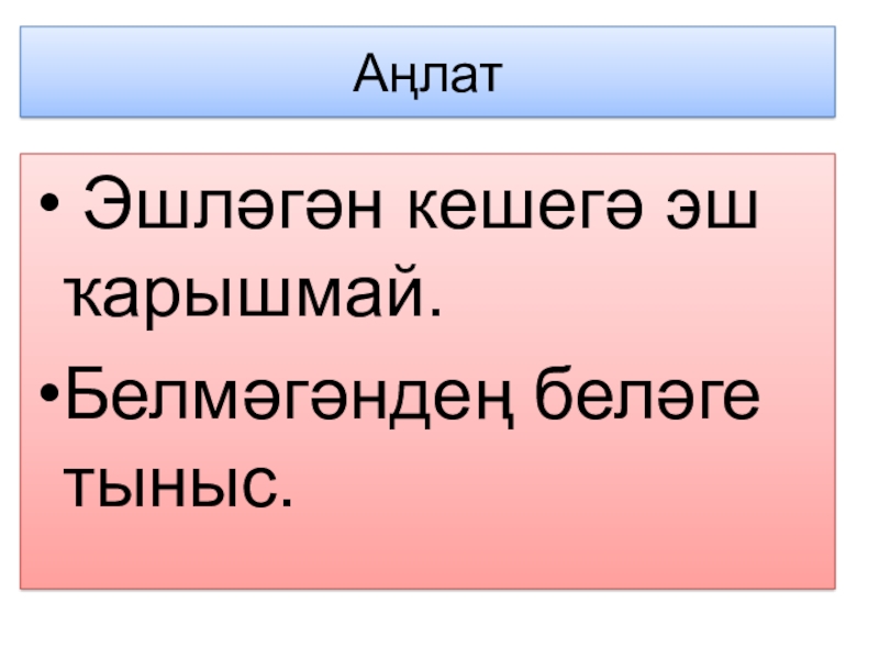 Аңлат Эшләгән кешегә эш ҡарышмай.Белмәгәндең беләге тыныс.