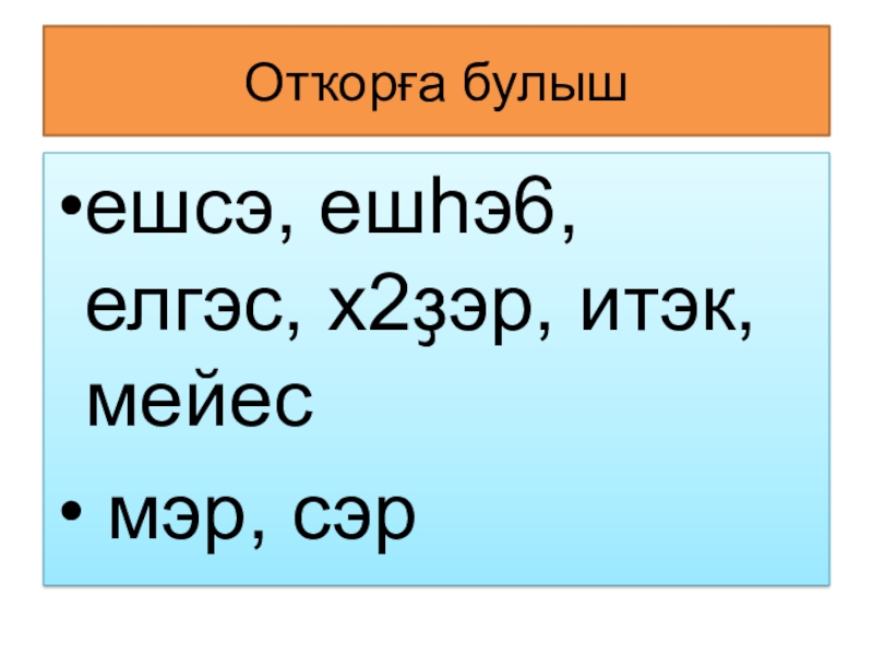 Отҡорға булышешсэ, ешһэ6, елгэс, х2ҙэр, итэк, мейес мэр, сэр