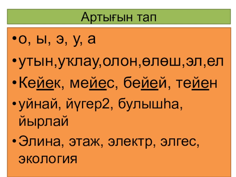 Артығын тапо, ы, э, у, аутын,уҡлау,олон,өлөш,эл,ел Кейек, мейес, бейей, тейен уйнай, йүгер2, булышһа,йырлай Элина, этаж, электр, элгес,