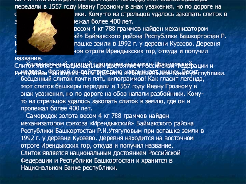 Удивительный золотой самородок называют Ирендекский медведь. Формой он действительно напоминает мишку. Весит бесценный слиток почти пять килограммов! Как гласит легенда, этот слиток башкиры передали в 1557 году Ивану Грозному в знак уважения, но по дороге на обоз напали разбойники. Кому-то из стрельцов удалось закопать слиток в землю, где он и пролежал более 400 лет.