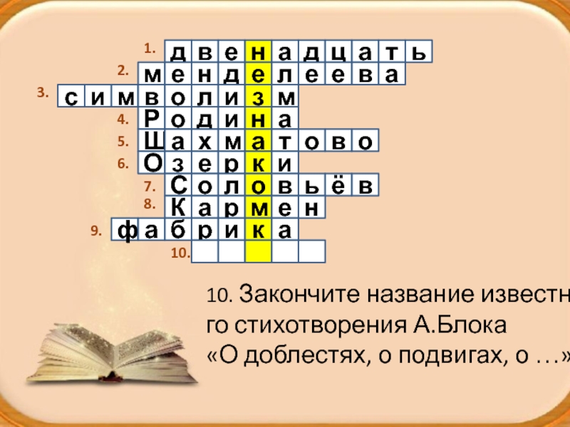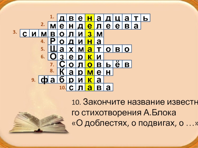 двенадцатьменделеевасимволизмРодинаШахматовоОзеркиСоловьёвКарменфабрика1.2.3.4.5.6.7.8.9.10.10. Закончите название известно-го стихотворения А.Блока«О доблестях, о подвигах, о …».