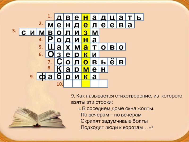 двенадцатьменделеевасимволизмРодинаШахматовоОзеркиСоловьёвКармен1.2.3.4.5.6.7.8.9.10.9. Как называется стихотворение, из которого взяты эти строки:    « В соседнем доме окна